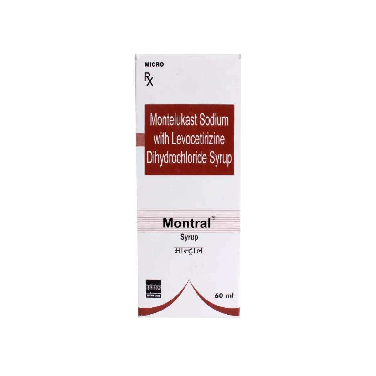 Montral Syrup, containing Montelukast, is a leukotriene receptor antagonist primarily used in the management of asthma and allergic rhinitis. Montelukast works by blocking the action of leukotrienes, which are inflammatory mediators released by the body that cause bronchoconstriction, mucus production, and inflammation in the airways. By inhibiting these effects, Montelukast helps to reduce airway inflammation, prevent bronchospasm, and alleviate symptoms such as wheezing, shortness of breath, and chest tightness associated with asthma. In allergic rhinitis, it reduces nasal congestion, sneezing, and itching. The syrup formulation is particularly suitable for pediatric patients and those who have difficulty swallowing tablets, ensuring consistent dosing and improved adherence to treatment regimens. It is typically used as a long-term controller medication rather than for acute asthma attacks.