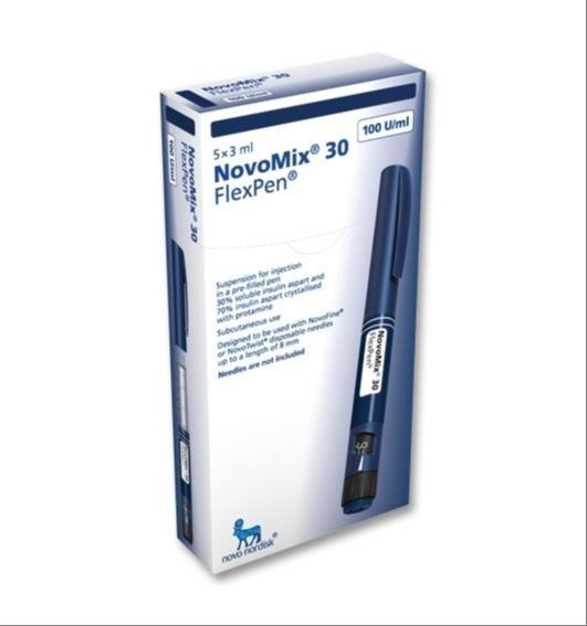NovoMix 30 FlexPen 3ML contains biphasic insulin aspart, a modern insulin analogue with a dual-action profile, consisting of 30% soluble insulin aspart and 70% protamine-crystallised insulin aspart. This formulation is specifically designed to provide both rapid-acting and intermediate-acting insulin effects, making it suitable for patients requiring both mealtime and basal glucose control. It is indicated for the treatment of diabetes mellitus in adults, adolescents, and children aged 10 years and above. The rapid-acting component helps to control postprandial glucose excursions, typically administered shortly before a meal, while the intermediate-acting component provides sustained glucose lowering throughout the day, addressing basal insulin needs. Administered via a convenient pre-filled pen, it aims to simplify the insulin regimen and improve adherence, contributing to better overall glycemic management and reduction in HbA1c levels, thereby mitigating the risk of long-term diabetic complications associated with uncontrolled blood sugar levels. Regular monitoring of blood glucose is crucial to optimize dosing.