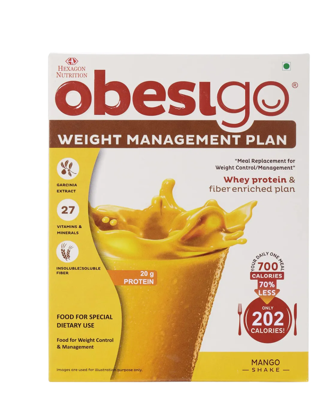 Obesigo Mango Powder is a nutritional meal replacement supplement formulated with active ingredients such as whey protein, fructose, dietary fibers (inulin and oat bran), medium-chain triglycerides (MCTs), vitamins, and minerals. It is primarily intended for individuals looking to lose weight or maintain a healthy weight. Its low-calorie, high-protein formula helps increase feelings of fullness, which may assist in reducing overall calorie intake.
