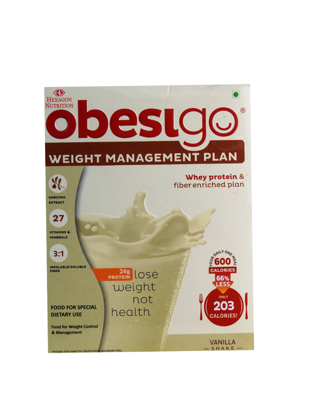 Obesigo Vanilla Powder is a specially formulated nutritional supplement designed to support weight loss and help manage blood sugar levels, particularly in individuals with diabetes. It features a balanced blend of maltodextrin, whey protein, soya protein, fructo-oligosaccharides, and dietary fiber. These ingredients work together to improve digestion, promote satiety, and provide sustained energy throughout the day.