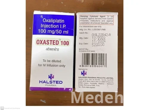 Oxasted 100mg Injection contains Oxaliplatin, a platinum-based antineoplastic agent primarily used in the treatment of various cancers, particularly colorectal cancer. It functions by forming DNA adducts, which interfere with DNA replication and transcription, ultimately leading to programmed cell death in rapidly dividing cancer cells. This mechanism makes it a potent cytotoxic agent. It is typically administered intravenously, often in combination with other chemotherapeutic agents like fluoropyrimidines (e.g., 5-fluorouracil and leucovorin) as part of established regimens such as FOLFOX. Its efficacy lies in its ability to disrupt the cellular machinery essential for cancer cell proliferation and survival.