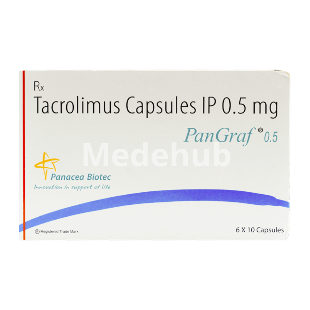 Pangraf 0.5mg Capsule contains tacrolimus, an immunosuppressant belonging to the class of medicines called calcineurin inhibitors. It is used in combination with other medicines to prevent organ rejection in patients who have undergone liver, kidney, heart, or other transplants. It works by controlling the body’s immune system to help it accept the transplanted organ.
