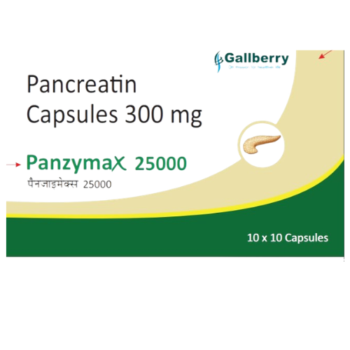 PANZYMAX 25000 is a potent pancreatic enzyme replacement therapy designed to aid digestion in individuals with exocrine pancreatic insufficiency (EPI). EPI occurs when the pancreas does not produce enough digestive enzymes (lipase, amylase, and protease) to break down fats, carbohydrates, and proteins effectively. This leads to maldigestion, malabsorption, and symptoms such as steatorrhea (fatty stools), abdominal pain, bloating, and weight loss. PANZYMAX 25000 provides a concentrated dose of these essential enzymes, derived from porcine pancreatic extracts, to supplement the body's natural production. By taking this medication with meals, patients can significantly improve their ability to digest food, absorb nutrients, and alleviate the debilitating symptoms associated with pancreatic enzyme deficiency, thereby improving their nutritional status and quality of life.