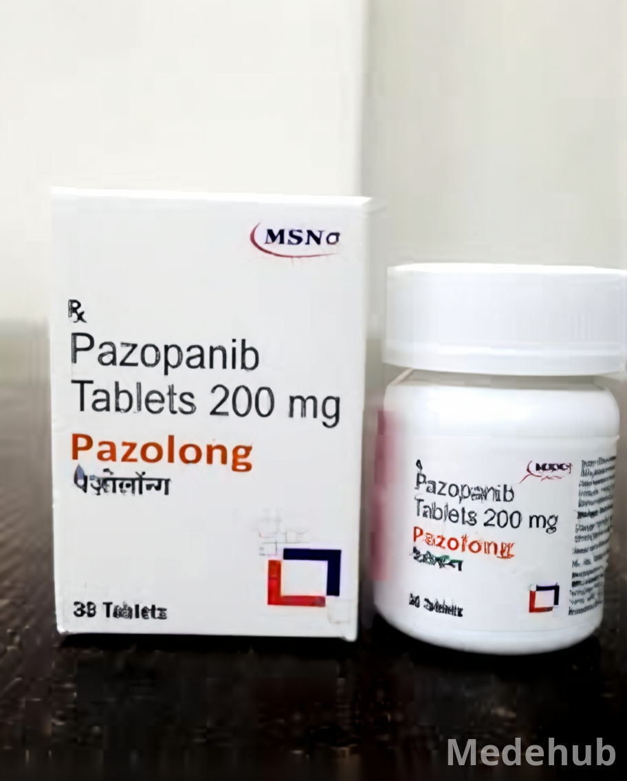 Pazolong 200mg Tablet contains pazopanib, an oral multi-targeted receptor tyrosine kinase inhibitor. This medication functions by selectively inhibiting several key enzymes, including vascular endothelial growth factor receptors (VEGFR-1, -2, -3), platelet-derived growth factor receptors (PDGFR-α/β), and c-Kit. These tyrosine kinases play critical roles in tumor angiogenesis (the formation of new blood vessels that feed tumors) and the proliferation of cancer cells. By blocking these specific pathways, pazopanib effectively disrupts the growth and spread of malignant cells.