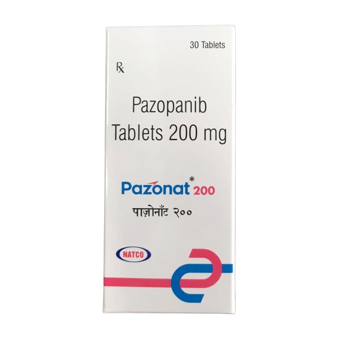 Pazonat 200mg Tablet contains pazopanib, an oral multi-targeted receptor tyrosine kinase inhibitor. This medication functions by selectively inhibiting several key enzymes, including vascular endothelial growth factor receptors (VEGFR-1, -2, -3), platelet-derived growth factor receptors (PDGFR-α/β), and c-Kit. These tyrosine kinases play critical roles in tumor angiogenesis (the formation of new blood vessels that feed tumors) and the proliferation of cancer cells. By blocking these specific pathways, pazopanib effectively disrupts the growth and spread of malignant cells.