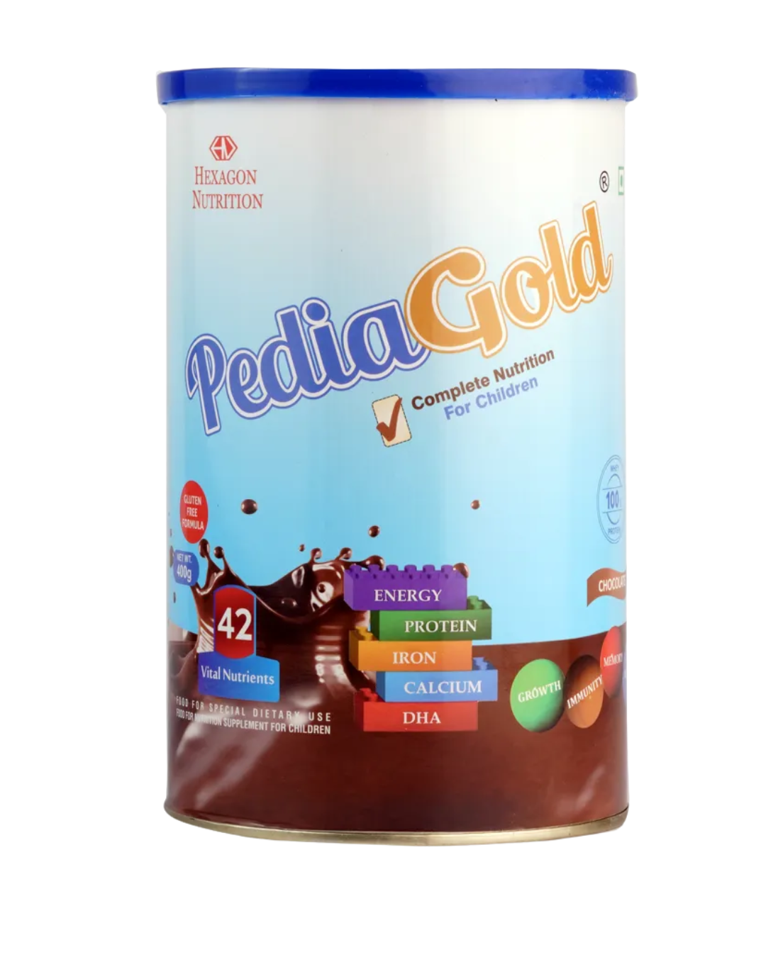 Pedia Gold Chocolate Powder is a complete nutritional supplement specially formulated for children. It is enriched with key neuro-nutrients such as DHA, ARA, choline, taurine, and inositol, which support brain development and enhance memory and cognitive function. The high-quality whey protein in the formula helps strengthen immunity, while the presence of FOS (Fructo-oligosaccharides) promotes better digestion and gut health.