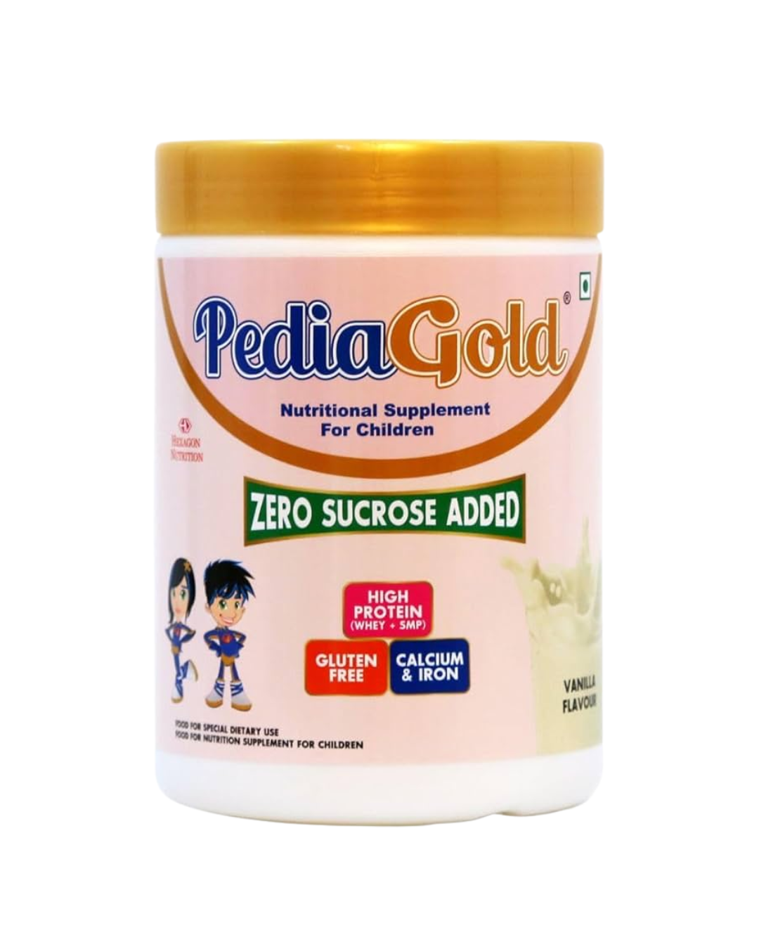 Pediagold Vanilla Powder is a specially designed nutritional supplement aimed at supporting the growth and overall development of children. It contains high-quality whey protein, which is essential for muscle growth and development. The addition of medium-chain triglycerides (MCT) provides a steady source of energy. Enriched with docosahexaenoic acid (DHA), it supports healthy brain function. This formula also includes a wide range of vital vitamins and minerals that work together to boost its nutritional value.