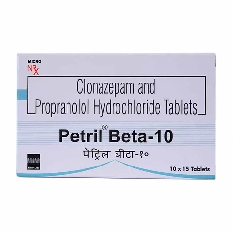 PETRIL BETA is a fixed-dose combination medication that integrates the therapeutic actions of clonazepam, a benzodiazepine, and propranolol, a non-selective beta-adrenergic blocker. Clonazepam primarily functions by potentiating the effects of gamma-aminobutyric acid (GABA) in the central nervous system, leading to pronounced anxiolytic, anticonvulsant, and sedative properties. Concurrently, propranolol mitigates the peripheral physical manifestations of anxiety, such as tachycardia, tremors, and excessive sweating, by blocking beta-adrenergic receptors. This synergistic combination is particularly advantageous for managing conditions where both the psychological distress and the accompanying somatic symptoms of anxiety or panic disorders are prominent. Propranolol is well-absorbed following oral administration but undergoes extensive first-pass metabolism, while clonazepam exhibits a longer elimination half-life, ensuring sustained therapeutic effects and comprehensive symptom control.