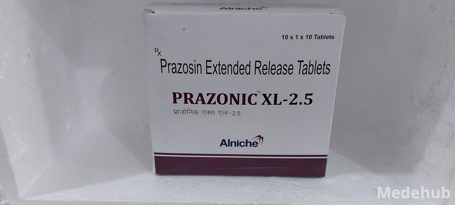 PRAZONIC XL-2.5 TAB contains Prazosin, an alpha-1 adrenergic blocker, which is a medication primarily utilized for the treatment of essential hypertension (high blood pressure) and the symptomatic relief of benign prostatic hyperplasia (BPH). Its mechanism of action involves relaxing the smooth muscles in the walls of blood vessels, leading to vasodilation and a subsequent reduction in blood pressure. In the context of BPH, it specifically relaxes the muscles in the prostate and bladder neck, which significantly improves urine flow and alleviates bothersome urinary symptoms such as hesitancy, weak stream, and frequent urination. The "XL" formulation ensures an extended release of the medication, allowing for convenient once-daily dosing and providing consistent therapeutic effects throughout the day.