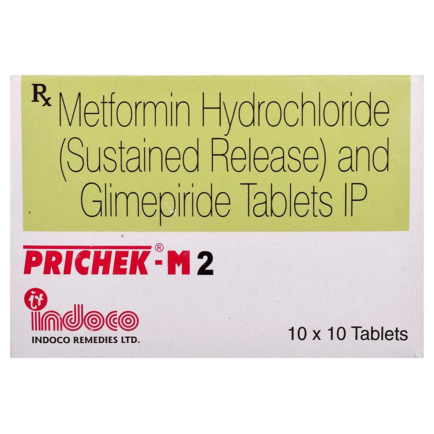 PRICHEK-M 2MG is a combination oral antidiabetic medication containing Glimepiride (2mg) and Metformin, used for the management of type 2 diabetes mellitus. Glimepiride, a sulfonylurea, stimulates insulin release from pancreatic beta cells, thereby lowering blood glucose levels. Metformin, a biguanide, reduces hepatic glucose production and improves insulin sensitivity in peripheral tissues, allowing the body to use insulin more effectively. This dual mechanism of action provides comprehensive blood sugar control.