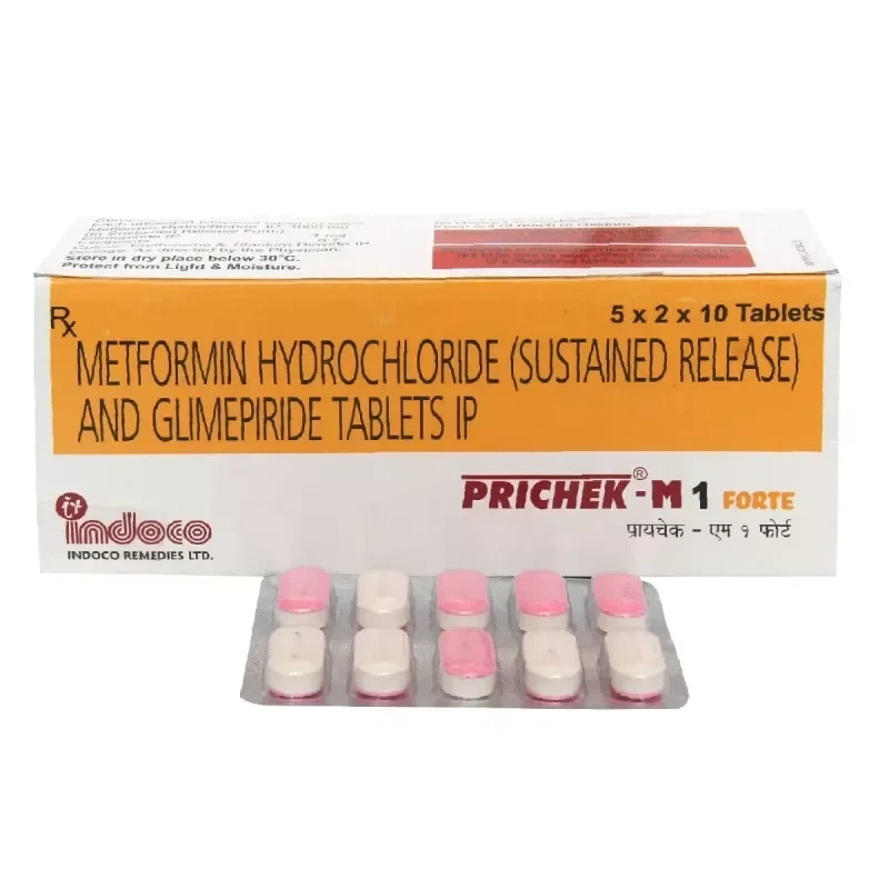 PRICHEK M1 FORTE is a combination oral antidiabetic medication containing Glimepiride (1mg) and a higher dose of Metformin, indicated for the management of type 2 diabetes mellitus. Glimepiride, a sulfonylurea, stimulates the beta cells of the pancreas to release more insulin, thereby lowering blood glucose levels. Metformin, a biguanide, primarily reduces glucose production by the liver and enhances insulin sensitivity in peripheral tissues, allowing the body to use insulin more effectively.