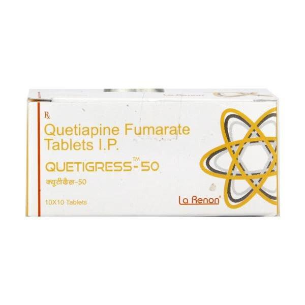 Quetigress-50, featuring quetiapine as its active compound, is an atypical antipsychotic medication primarily employed in the comprehensive treatment of schizophrenia, bipolar disorder (including manic, mixed, and depressive episodes), and as an adjunctive therapy for major depressive disorder. It achieves its therapeutic effects by modulating the activity of several key neurotransmitters in the brain, notably dopamine and serotonin. Quetiapine functions as an antagonist at dopamine D2 and serotonin 5-HT2A receptors, which effectively helps to reduce severe psychotic symptoms such as hallucinations and delusions, stabilize extreme mood swings, and alleviate profound depressive episodes.