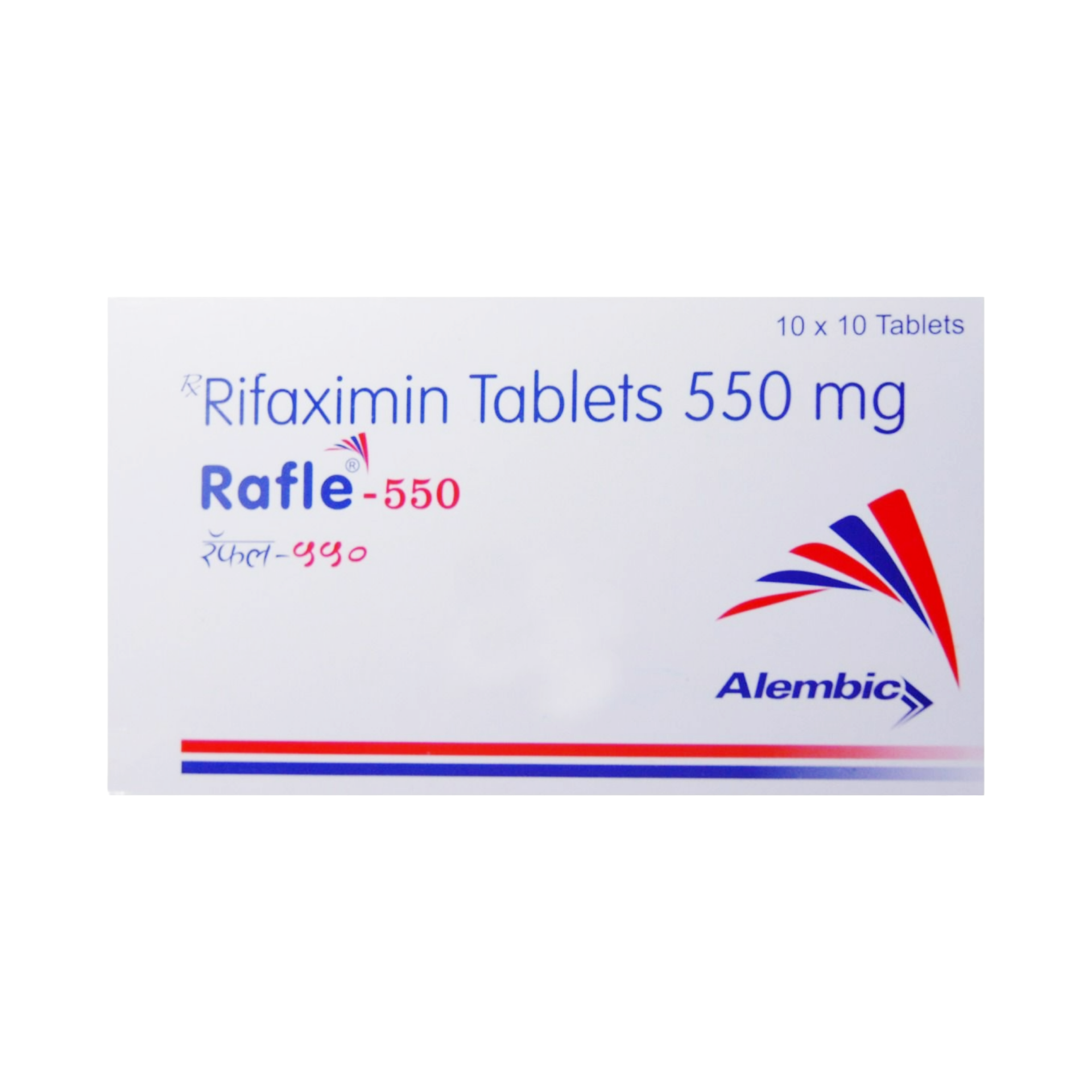 RAFLE 550 TAB contains Rifaximin 550mg, a non-systemic antibiotic that works locally in the gastrointestinal tract. Unlike most antibiotics, Rifaximin is poorly absorbed into the bloodstream, meaning it exerts its antibacterial effects primarily within the gut lumen. It works by inhibiting bacterial RNA synthesis, thereby reducing the number of certain bacteria in the intestines. This localized action minimizes systemic side effects and reduces the risk of developing antibiotic resistance in other parts of the body.