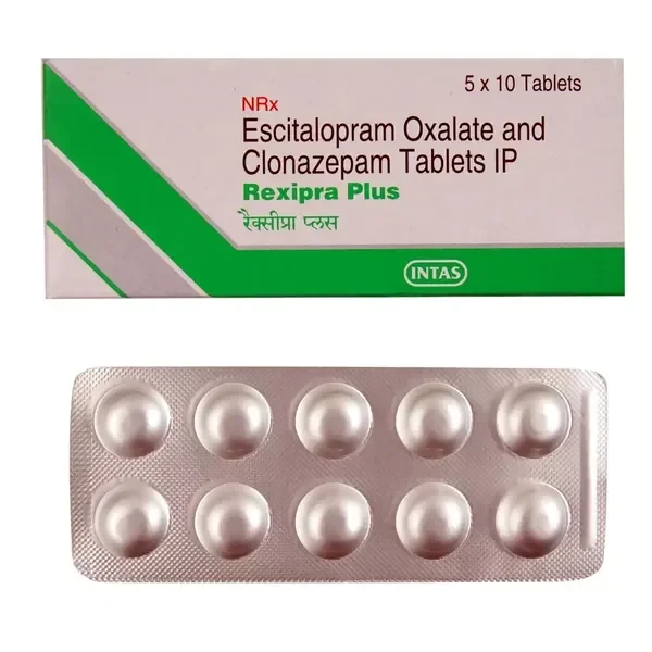 Rexipra Plus is a dual-component medication designed to address both depressive and significant anxiety symptoms. It combines Escitalopram, a highly selective serotonin reuptake inhibitor (SSRI), with Clonazepam, a potent benzodiazepine. Escitalopram functions by increasing the concentration of serotonin in the brain's synaptic clefts, thereby enhancing serotonergic neurotransmission, which is vital for mood regulation and anxiety reduction. Clonazepam, on the other hand, exerts its effects by potentiating the activity of gamma-aminobutyric acid (GABA), the brain's primary inhibitory neurotransmitter, leading to a rapid calming effect on the central nervous system. This synergistic combination is particularly beneficial for patients experiencing major depressive disorder alongside pronounced anxiety, panic attacks, or generalized anxiety disorder, where Clonazepam offers immediate symptomatic relief while Escitalopram works to establish long-term therapeutic stability and prevent recurrence. The combined approach aims for comprehensive symptom management.