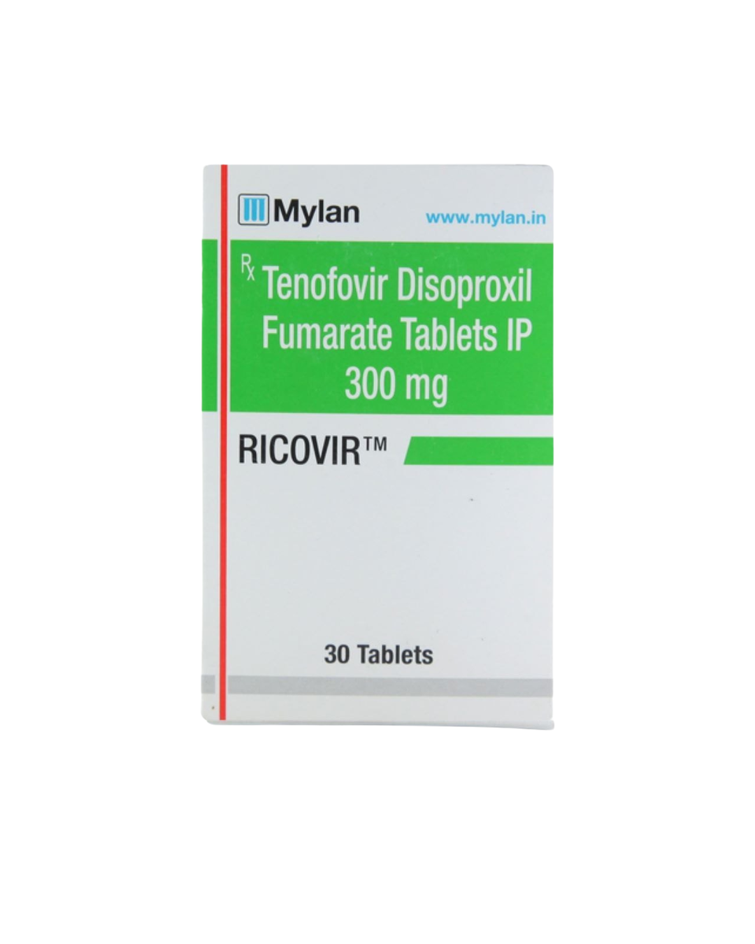 Ricovir 300 mg Tablet contains the active ingredient Tenofovir Disoproxil Fumarate, which belongs to the class of antiretroviral (antiviral) medications. It is used to treat infections caused by HIV (human immunodeficiency virus) and HBV (hepatitis B virus). As a nucleotide reverse transcriptase inhibitor (NRTI), it works by blocking the enzymes (HIV reverse transcriptase and hepatitis B DNA polymerase) essential for virus replication. This medication should always be taken in combination with other drugs to effectively treat HIV infection. Ricovir 300 mg Tablet is intended for adults and adolescents aged 12 to 18 years. For HIV treatment, it is prescribed to adolescents who have previously been treated with other HIV medications that are no longer fully effective due to resistance or side effects. The safety and effectiveness of this tablet have not been studied in patients over 65 years old.