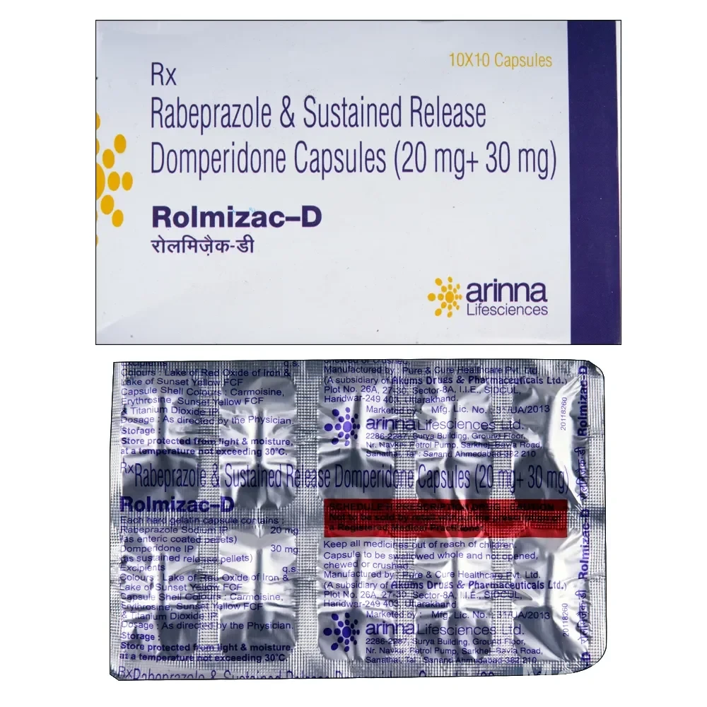 Rolmizac D Capsule is a dual-action medication specifically formulated to address conditions related to excessive stomach acid and impaired gastrointestinal motility, such as gastroesophageal reflux disease (GERD) and peptic ulcers. It combines a proton pump inhibitor (PPI), typically rabeprazole or omeprazole, which works by profoundly reducing the production of stomach acid by blocking the proton pumps in the stomach lining. Complementing this, it includes a prokinetic agent like domperidone, which enhances the movement of food through the stomach and intestines, thereby reducing the backward flow of acid into the esophagus and alleviating symptoms like nausea and vomiting. This synergistic approach provides comprehensive relief from heartburn, acid regurgitation, and indigestion, promoting healing of the esophageal and gastric mucosa and improving overall digestive comfort.