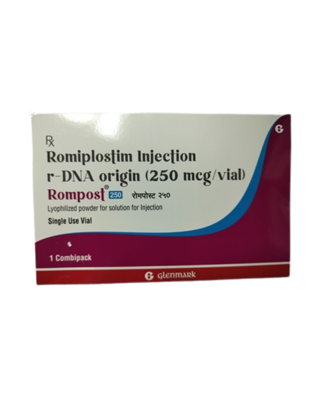 Rompost 250mg Injection is a platelet-stimulating agent that contains Romiplostim. It is used to treat immune primary thrombocytopenia (ITP), a condition in which the immune system mistakenly destroys the body’s own platelets, leading to low platelet counts. This medication is primarily prescribed to adults and children aged 18 and older when other treatments—such as corticosteroids, immunoglobulins, or splenectomy (removal of the spleen)—have not been effective.