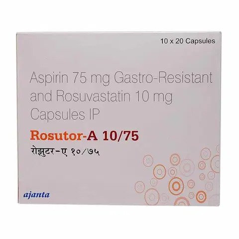Rosutor A10/75mg Tablet is a combination medication containing Rosuvastatin (10mg) and Aspirin (75mg). This dual therapy is primarily indicated for the prevention of cardiovascular events in patients at high risk, particularly those with established atherosclerotic cardiovascular disease, a history of myocardial infarction, or stroke. Rosuvastatin is an HMG-CoA reductase inhibitor (statin) that effectively lowers elevated cholesterol levels by reducing hepatic cholesterol synthesis. Aspirin is an antiplatelet agent that inhibits platelet aggregation by irreversibly blocking cyclooxygenase-1 (COX-1), thereby preventing the formation of blood clots. The combination of these two agents addresses both lipid management and antiplatelet therapy, providing comprehensive protection against the progression of atherosclerosis and thrombotic events, which are key contributors to cardiovascular morbidity and mortality.