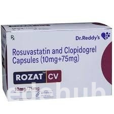 ROZAT CV is a combination medication containing Rosuvastatin and Clopidogrel. Rosuvastatin is a HMG-CoA reductase inhibitor (statin) that reduces cholesterol synthesis in the liver, leading to a decrease in LDL-C, total cholesterol, and triglycerides, while increasing HDL-C. Clopidogrel is an antiplatelet agent that selectively inhibits the binding of adenosine diphosphate (ADP) to its platelet receptor, thereby preventing platelet aggregation and thrombus formation. This combination is designed for patients at high risk of cardiovascular events.