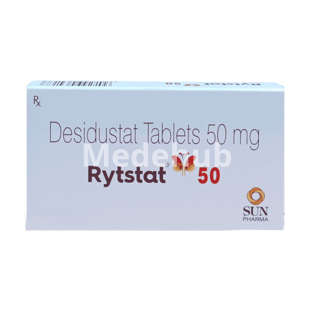Rytstat 50mg Tablet is a potent lipid-lowering agent, belonging to the class of medications known as statins. It is primarily prescribed to reduce elevated levels of total cholesterol, low-density lipoprotein (LDL-C or "bad" cholesterol), and triglycerides, while simultaneously increasing high-density lipoprotein (HDL-C or "good" cholesterol) in patients diagnosed with primary hypercholesterolemia, mixed dyslipidemia, and homozygous familial hypercholesterolemia. This medication works by inhibiting HMG-CoA reductase, a key enzyme in the liver responsible for cholesterol synthesis. By reducing the production of cholesterol, Rytstat helps to lower the overall cholesterol burden in the body, thereby significantly reducing the risk of cardiovascular events such as heart attack and stroke, and slowing the progression of atherosclerosis.