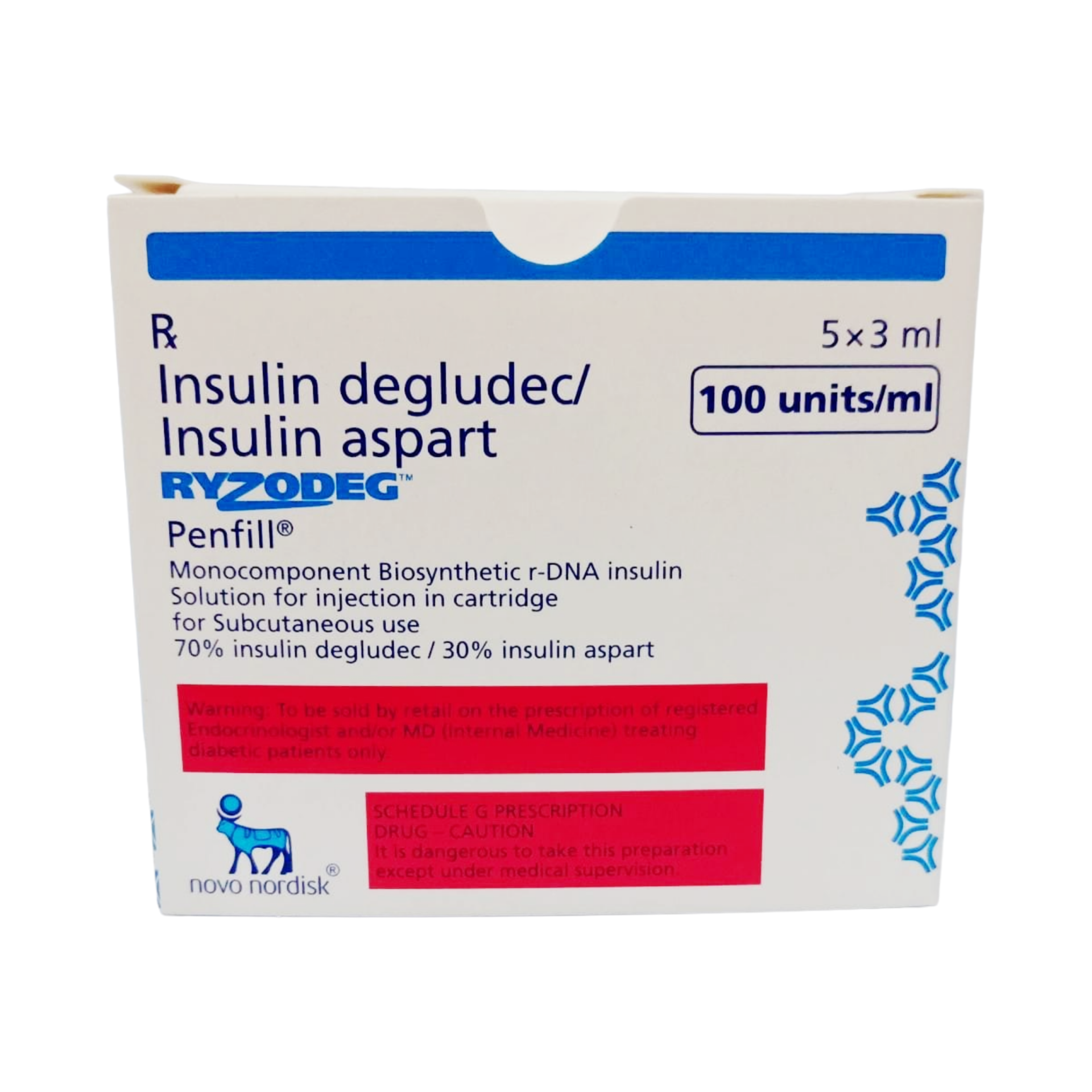 Ryzodeg Penfill 3ml is a unique co-formulation of insulin degludec (a long-acting basal insulin) and insulin aspart (a rapid-acting mealtime insulin). This innovative combination provides comprehensive glucose control by addressing both basal insulin needs for sustained blood sugar regulation and bolus insulin requirements for post-meal glucose spikes, all within a single injection. It is indicated for the treatment of diabetes mellitus in adults, adolescents, and children aged 1 year and above. Insulin degludec forms soluble multi-hexamers upon subcutaneous injection, creating a stable depot that ensures slow and continuous absorption, providing a flat and stable glucose-lowering effect for over 42 hours. Insulin aspart, conversely, acts quickly to manage glucose excursions after meals.