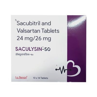 Saculysin 50, likely containing Sacubitril/Valsartan, is a combination medication used for the treatment of chronic heart failure with reduced ejection fraction (HFrEF). It belongs to a class of drugs known as angiotensin receptor-neprilysin inhibitors (ARNIs). Sacubitril inhibits neprilysin, an enzyme responsible for the degradation of natriuretic peptides, leading to increased levels of these peptides which promote vasodilation and natriuresis. Valsartan is an angiotensin II receptor blocker (ARB) that inhibits the effects of angiotensin II, reducing vasoconstriction and aldosterone secretion. The synergistic action of these two components helps to reduce cardiac workload, improve cardiac function, and decrease the risk of cardiovascular death and heart failure hospitalization.