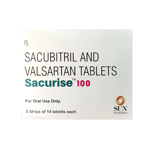 SACURISE 100, containing sacubitril and valsartan, is an angiotensin receptor-neprilysin inhibitor (ARNI) indicated for the treatment of chronic heart failure with reduced ejection fraction (HFrEF). This medication combines a neprilysin inhibitor (sacubitril) with an angiotensin receptor blocker (valsartan) to provide a dual mechanism of action. Sacubitril works by inhibiting neprilysin, an enzyme responsible for the degradation of beneficial natriuretic peptides, thereby increasing their levels. This leads to vasodilation, natriuresis, and diuresis, which are favorable effects in heart failure. Valsartan, on the other hand, blocks the angiotensin II type 1 receptor, counteracting the harmful effects of angiotensin II, such as vasoconstriction, aldosterone secretion, and cardiac remodeling. The synergistic action of these two components helps to significantly reduce cardiovascular mortality and heart failure hospitalizations in eligible patients with HFrEF. The 100mg dose typically refers to the combined strength (e.g., 49mg sacubitril / 51mg valsartan).