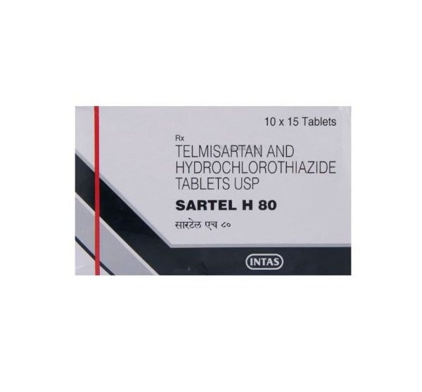 Sartel H 80 is a fixed-dose combination medication designed for the effective treatment of essential hypertension, particularly in individuals whose blood pressure is not adequately managed by a single antihypertensive agent. This formulation combines Telmisartan, an angiotensin II receptor blocker (ARB), with Hydrochlorothiazide (HCTZ), a thiazide diuretic. Telmisartan works by selectively blocking the AT1 receptor, thereby inhibiting the vasoconstrictive and aldosterone-secreting effects of angiotensin II. This action leads to vasodilation and a reduction in blood pressure. Hydrochlorothiazide complements this by increasing the excretion of sodium and water through inhibition of sodium reabsorption in the distal convoluted tubule of the kidney, further contributing to blood pressure reduction by decreasing plasma volume. The dual mechanism of action provides an additive antihypertensive effect, offering more comprehensive and sustained blood pressure control than either agent alone. This combination is a valuable therapeutic option for reducing the risk of cardiovascular complications associated with uncontrolled hypertension.