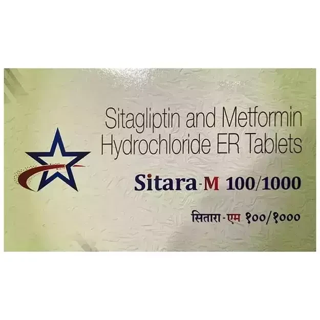 SITARA M 100/1000 is a combination medication used for the management of Type 2 Diabetes Mellitus, featuring Sitagliptin and Metformin. Sitagliptin is a dipeptidyl peptidase-4 (DPP-4) inhibitor that works by increasing the levels of incretin hormones (GLP-1 and GIP). These hormones enhance glucose-dependent insulin release from pancreatic beta cells and decrease glucagon secretion from alpha cells, leading to improved glucose homeostasis. Metformin, a biguanide, primarily reduces hepatic glucose production, decreases intestinal absorption of glucose, and improves insulin sensitivity by increasing peripheral glucose uptake and utilization. This synergistic combination addresses multiple pathophysiological defects in Type 2 Diabetes, providing comprehensive and effective glycemic control. It is particularly beneficial for patients who have not achieved adequate control with monotherapy or who require a more robust approach to manage their blood sugar levels and prevent long-term complications.