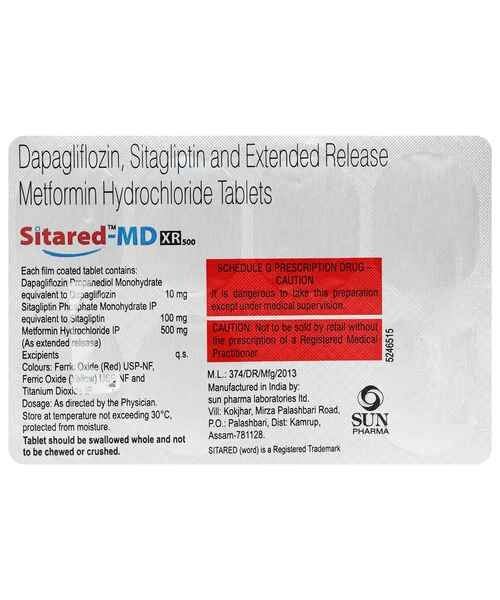 Sitared-MD XR 100/10/500 Tablet is a sophisticated extended-release oral medication designed for the comprehensive management of Type 2 Diabetes Mellitus. This triple-combination therapy typically comprises Sitagliptin (a DPP-4 inhibitor), an SGLT2 inhibitor like Dapagliflozin, and Metformin (a biguanide). Sitagliptin works by enhancing the body's natural incretin hormones, which increase insulin release and decrease glucagon secretion in a glucose-dependent manner, thereby improving glycemic control. Dapagliflozin, an SGLT2 inhibitor, reduces glucose reabsorption in the kidneys, leading to increased urinary glucose excretion and lower blood glucose levels, while also offering cardiovascular and renal benefits.