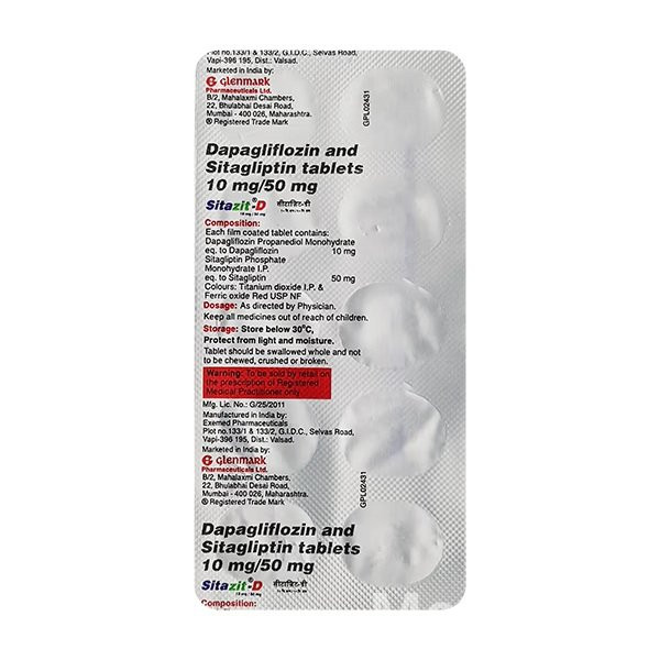SITAZIT D 10/50 10S is an oral antidiabetic medication combining Dapagliflozin and Sitagliptin, used to improve glycemic control in adults with type 2 diabetes mellitus. Dapagliflozin is a sodium-glucose co-transporter 2 (SGLT2) inhibitor that works by reducing glucose reabsorption in the kidneys, leading to increased urinary glucose excretion and a subsequent reduction in blood glucose levels, independent of insulin. Sitagliptin is a dipeptidyl peptidase-4 (DPP-4) inhibitor that enhances the body's natural ability to lower high blood glucose levels by increasing the active levels of incretin hormones. This dual mechanism of action provides comprehensive glycemic control, addressing different pathways involved in glucose regulation. The combination also offers benefits such as weight management and potential cardiovascular and renal protection, making it a versatile option for managing type 2 diabetes.