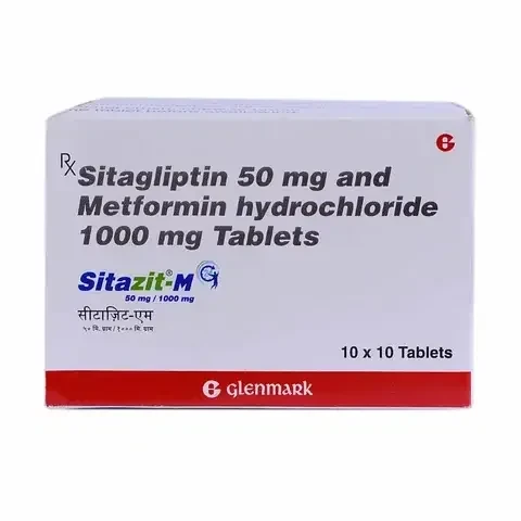 SITAZIT M 50/1000 MG 10S is an oral antidiabetic medication combining Sitagliptin and Metformin, used to improve glycemic control in adults with type 2 diabetes mellitus. Sitagliptin is a dipeptidyl peptidase-4 (DPP-4) inhibitor that works by increasing the levels of incretin hormones (GLP-1 and GIP), which in turn stimulate insulin release and decrease glucagon secretion in a glucose-dependent manner. Metformin, a biguanide, primarily reduces hepatic glucose production, decreases intestinal absorption of glucose, and improves insulin sensitivity by increasing peripheral glucose uptake and utilization. This synergistic action helps to lower both fasting and post-meal blood glucose levels, making it an effective option for patients whose diabetes is not adequately controlled by diet, exercise, and either Sitagliptin or Metformin alone.