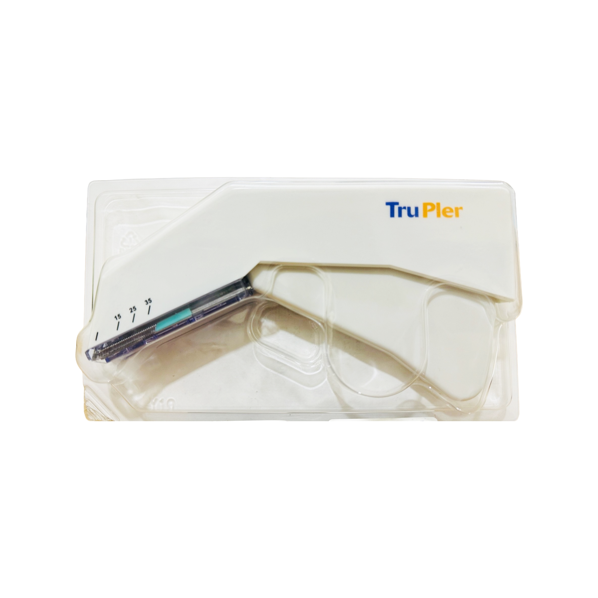 The Skin Stapler Tru Pler is a sterile, single-use medical device designed for rapid and efficient closure of skin wounds and incisions. It utilizes surgical staples, typically made of stainless steel, to approximate wound edges, providing a secure and consistent closure. This device is widely used in various surgical specialties, including general surgery, orthopedics, gynecology, and emergency medicine, due to its speed, ease of use, and ability to achieve excellent cosmetic results when applied correctly. The stapler is pre-loaded with a specific number of staples and is designed for ergonomic handling, allowing for precise staple placement.