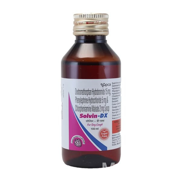 SOLVIN DX SYP 100ML is a combination medication primarily used for the symptomatic relief of dry, irritating coughs and associated cold symptoms. This syrup typically contains a cough suppressant (antitussive), a decongestant, and an antihistamine. The cough suppressant works by acting on the cough center in the brain, reducing the urge to cough without suppressing the beneficial productive cough. The decongestant helps to narrow blood vessels in the nasal passages, reducing swelling and congestion, thereby making it easier to breathe through the nose. The antihistamine component helps to alleviate allergic symptoms such as sneezing, runny nose, and watery eyes, which are often associated with common colds and upper respiratory infections.