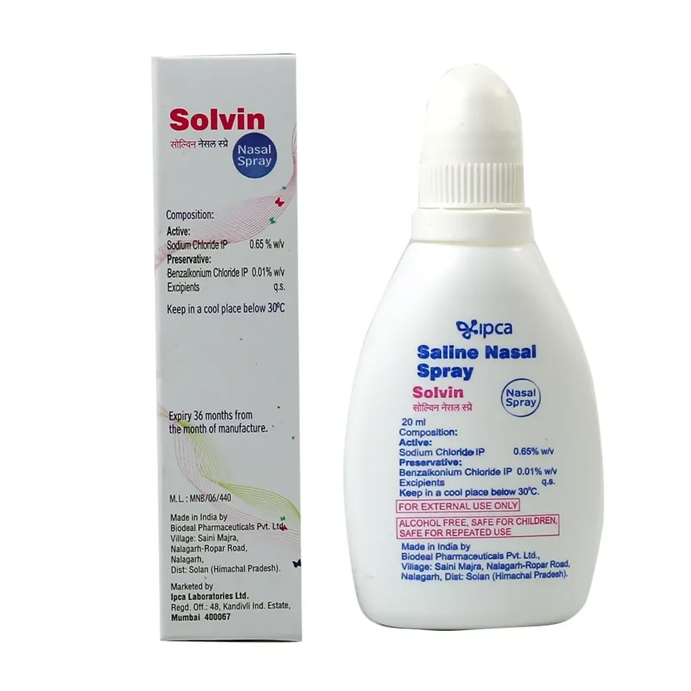 SOLVIN N/S 20ML is a nasal spray primarily containing a sterile isotonic saline solution. It is designed to provide gentle and effective relief from nasal congestion, dryness, and irritation. The isotonic saline solution works by moisturizing the nasal passages, helping to loosen and thin thick mucus, and facilitating its removal. It also helps to wash away allergens, irritants, and pathogens from the nasal cavity, promoting clearer breathing and reducing the likelihood of infection. Unlike medicated nasal sprays, saline solutions do not cause rebound congestion, making them suitable for regular and prolonged use.