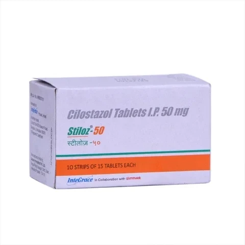 STILOZ 50 contains Cilostazol 50mg, a phosphodiesterase-3 (PDE3) inhibitor primarily used for the symptomatic management of intermittent claudication in patients with peripheral artery disease (PAD). Cilostazol works by inhibiting PDE3, which leads to an increase in intracellular cyclic AMP (cAMP) levels in platelets and vascular smooth muscle cells. This results in potent antiplatelet effects, reducing platelet aggregation, and direct arterial vasodilation, particularly in the femoral circulation. By improving blood flow to the legs and reducing platelet aggregation, Cilostazol helps to alleviate the pain and cramping experienced during exercise, thereby increasing walking distance and improving the quality of life for patients with intermittent claudication. It is a distinct therapeutic agent that addresses both the circulatory and thrombotic aspects of PAD, offering a targeted approach to symptom relief and functional improvement.