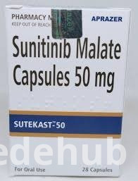 Sutekast 50mg Capsule is an oral multi-targeted receptor tyrosine kinase inhibitor (TKI) indicated for the treatment of various advanced cancers. It functions by blocking multiple receptor tyrosine kinases, including vascular endothelial growth factor receptors (VEGFRs), platelet-derived growth factor receptors (PDGFRs), and KIT, which are crucial for tumor angiogenesis, cell proliferation, and survival. By inhibiting these pathways, Sutekast effectively impedes tumor growth, metastasis, and the development of new blood vessels that supply tumors.