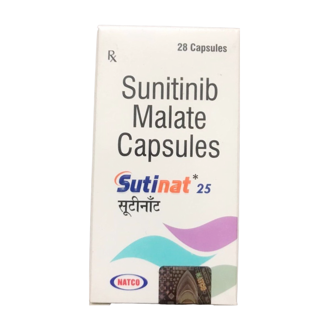 Sutinat 25mg Capsule is an oral multi-targeted receptor tyrosine kinase inhibitor (TKI) indicated for the treatment of various advanced cancers. It functions by blocking multiple receptor tyrosine kinases, including vascular endothelial growth factor receptors (VEGFRs), platelet-derived growth factor receptors (PDGFRs), and KIT, which are crucial for tumor angiogenesis, cell proliferation, and survival. By inhibiting these pathways, Sutinat effectively impedes tumor growth, metastasis, and the development of new blood vessels that supply tumors.