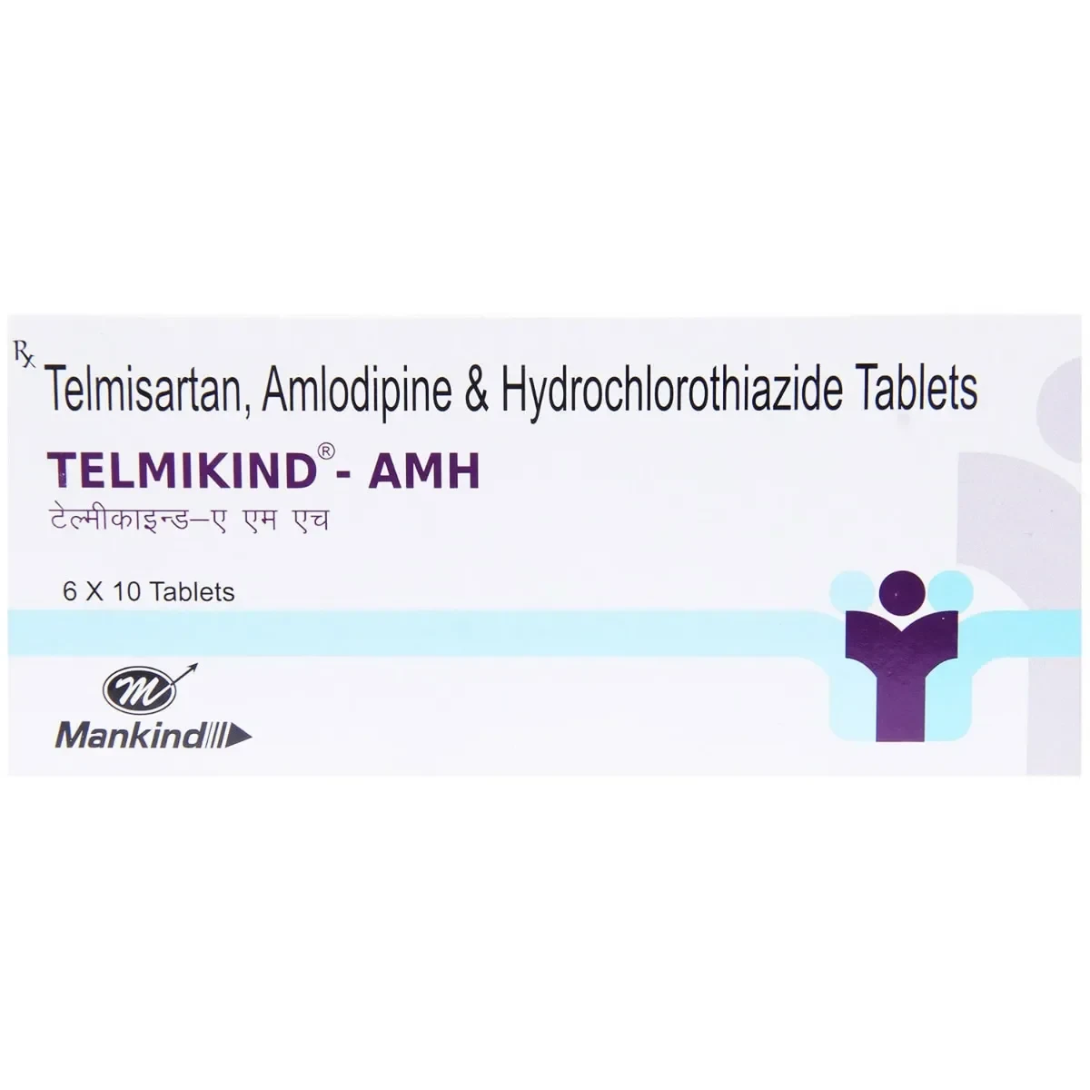 Telmikind AMH Tab is a comprehensive fixed-dose combination medication indicated for the treatment of essential hypertension, especially when blood pressure is not adequately controlled by dual therapy or lower-dose triple regimens. This formulation combines Telmisartan, an angiotensin II receptor blocker (ARB), Amlodipine, a dihydropyridine calcium channel blocker (CCB), and Hydrochlorothiazide, a thiazide diuretic. Telmisartan effectively lowers blood pressure by blocking the AT1 receptors, preventing the vasoconstrictive actions of angiotensin II and reducing aldosterone release. Amlodipine complements this by relaxing vascular smooth muscle, primarily in peripheral arterioles, through the inhibition of calcium ion influx, leading to reduced peripheral vascular resistance. Hydrochlorothiazide provides diuretic efficacy by increasing the renal excretion of sodium and water, thereby reducing plasma volume and contributing significantly to the antihypertensive effect. This comprehensive triple therapy targets distinct mechanisms of blood pressure regulation, ensuring powerful and sustained control for patients requiring aggressive management.