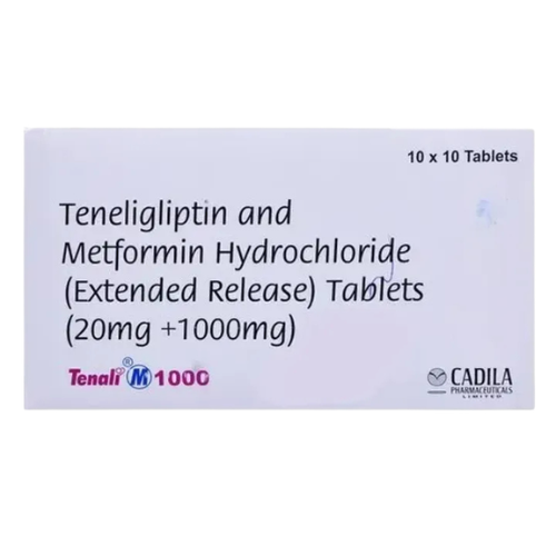 TENALI-M 1000 is a fixed-dose combination medication containing Teneligliptin and Metformin hydrochloride, indicated for the management of type 2 diabetes mellitus. Teneligliptin, a dipeptidyl peptidase-4 (DPP-4) inhibitor, enhances the body's natural ability to control blood glucose by increasing active incretin hormone levels, which stimulate glucose-dependent insulin secretion and suppress glucagon release. Metformin, a biguanide, primarily acts by reducing hepatic glucose production and improving insulin sensitivity in peripheral tissues, while also decreasing intestinal glucose absorption. This synergistic action of Teneligliptin and Metformin provides comprehensive glycemic control, helping to lower both fasting and post-meal blood glucose levels, thereby improving overall glycemic parameters in adults with type 2 diabetes.