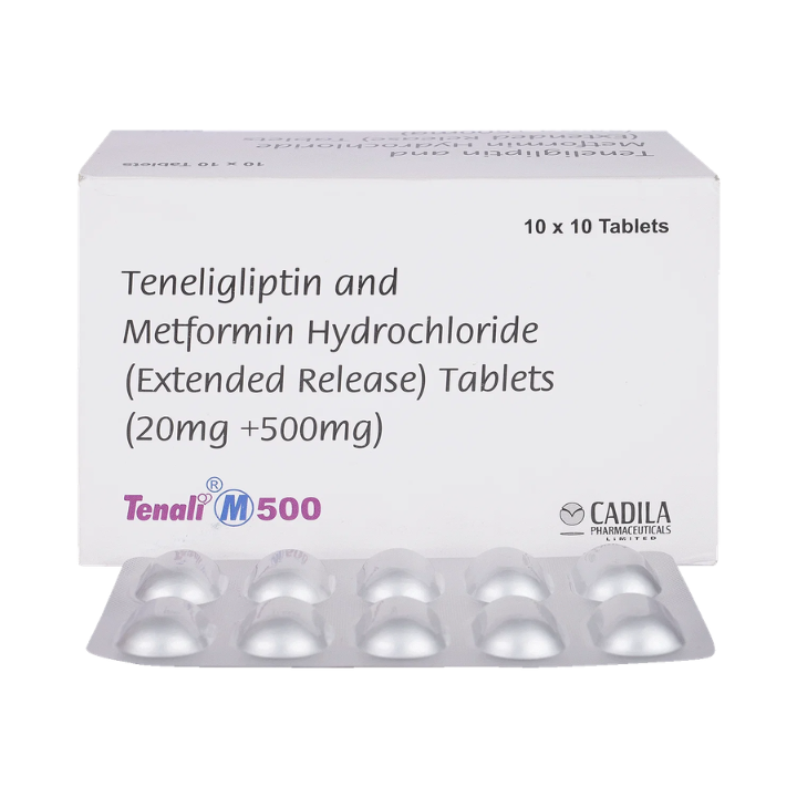 TENLI M 500 is a combination medication used for the treatment of type 2 diabetes mellitus, containing Teneligliptin and Metformin hydrochloride. Teneligliptin is a dipeptidyl peptidase-4 (DPP-4) inhibitor that works by increasing the levels of incretin hormones, which in turn enhance glucose-dependent insulin secretion and suppress glucagon secretion. Metformin, a biguanide, primarily reduces hepatic glucose production and improves insulin sensitivity in peripheral tissues, leading to decreased glucose absorption from the gastrointestinal tract. This dual mechanism of action provides comprehensive glycemic control by addressing multiple pathophysiological defects in type 2 diabetes, helping patients achieve target blood sugar levels when diet and exercise alone are insufficient.