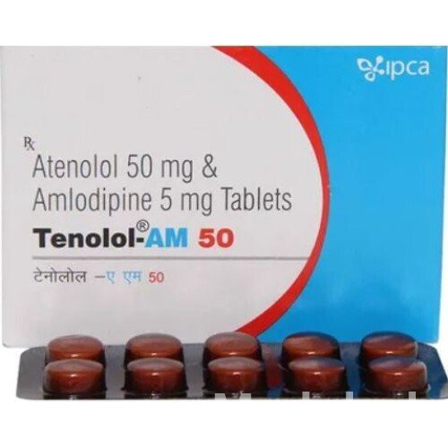 Tenolol AM 50 is a combination medication designed to treat high blood pressure and angina, featuring Atenolol, a selective beta-1 adrenergic blocker, and Amlodipine, a dihydropyridine calcium channel blocker. Atenolol reduces heart rate and the force of heart contractions, thereby decreasing blood pressure and the heart's oxygen demand. Amlodipine works by relaxing the blood vessels, which allows blood to flow more easily and further lowers blood pressure. This dual action provides comprehensive control over hypertension and helps to prevent angina attacks by improving blood flow to the heart. The synergistic effect of these two agents ensures effective management for patients who require more than one medication to achieve their target blood pressure and symptom control, contributing to improved cardiovascular outcomes and quality of life.