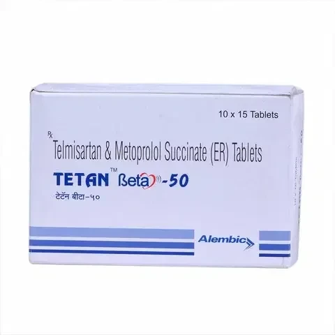 TETAN BETA 50 combines an angiotensin II receptor blocker (ARB), Telmisartan, with a beta-blocker, Metoprolol, to provide comprehensive management of hypertension. Telmisartan works by selectively blocking the binding of angiotensin II to its receptors in vascular smooth muscle, leading to vasodilation and a reduction in blood pressure. This action also helps to prevent cardiac remodeling and reduce the risk of cardiovascular events. Metoprolol, a selective beta-1 adrenergic receptor blocker, reduces heart rate and myocardial contractility, thereby decreasing cardiac output and lowering blood pressure. It also helps to reduce the workload on the heart and can be beneficial in conditions like angina.