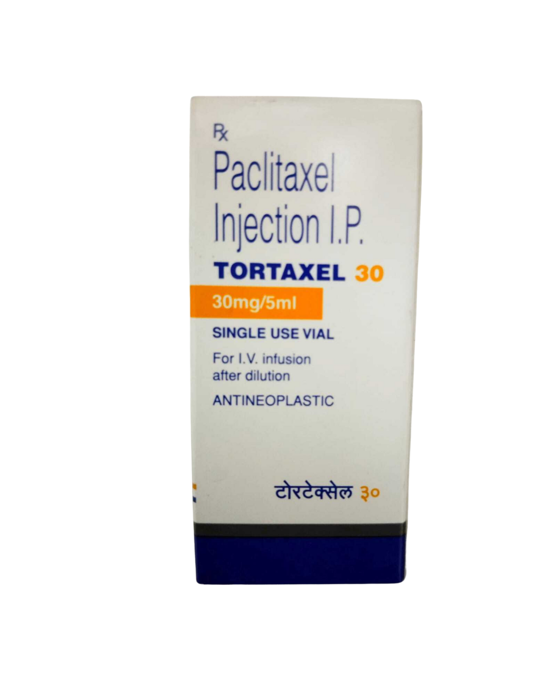 Tortaxel 30mg Injection is an anticancer medication used to treat breast cancer, non-small cell lung cancer, ovarian cancer, and AIDS-related cancers. Cancer occurs when cells divide and grow uncontrollably. This injection may be given alone or in combination with other anticancer drugs. It should not be used in patients with severe liver problems, uncontrolled infections, or low white blood cell or platelet counts.
