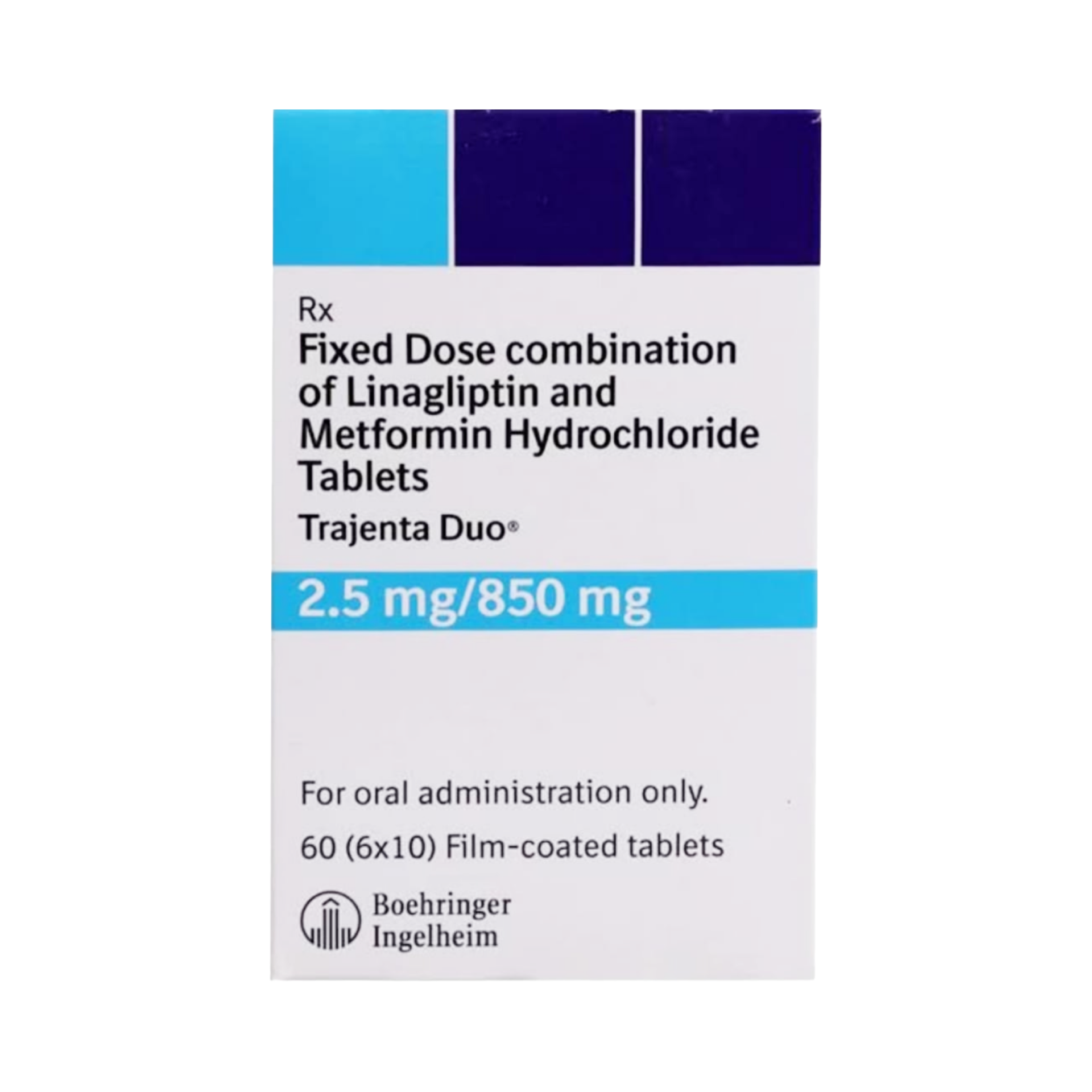Trajenta Duo 850 is a fixed-dose combination medication containing Linagliptin (2.5mg) and Metformin (850mg), indicated for the treatment of type 2 diabetes mellitus. Linagliptin functions as a dipeptidyl peptidase-4 (DPP-4) inhibitor, which enhances the body's natural ability to lower high blood glucose levels by increasing the active concentrations of incretin hormones. These hormones stimulate insulin release and suppress glucagon secretion in a glucose-dependent manner. Metformin, a biguanide, primarily acts by reducing glucose production in the liver, decreasing glucose absorption from the intestine, and improving insulin sensitivity in peripheral tissues. This synergistic action helps to achieve comprehensive and sustained control over blood sugar levels.