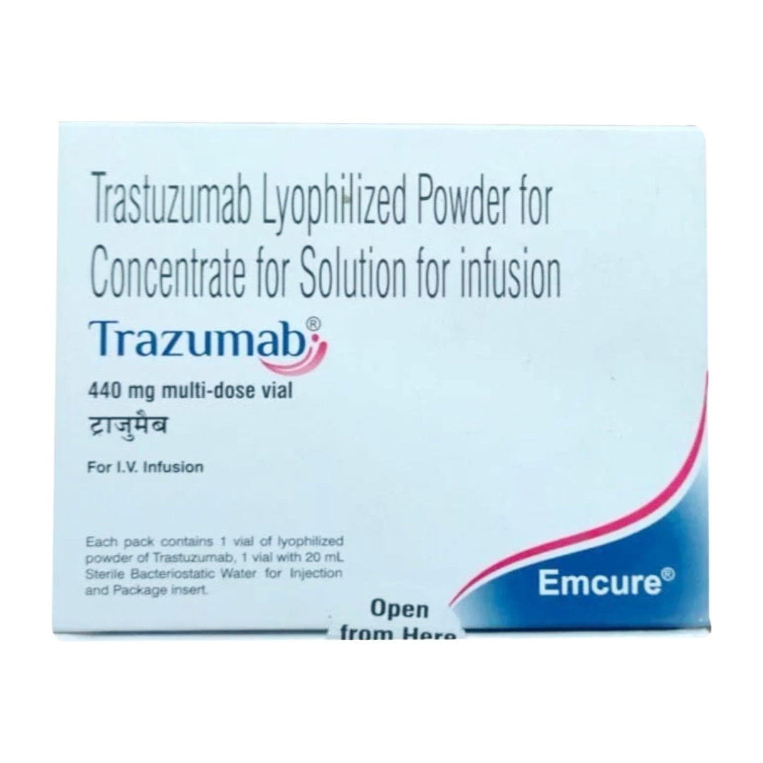Trazumab 440mg Injection is a targeted therapy containing Trastuzumab, a recombinant humanized monoclonal antibody that selectively binds to the extracellular domain of the human epidermal growth factor receptor 2 (HER2) protein. Overexpression of HER2 is observed in certain types of cancers, particularly breast cancer and gastric cancer, and is associated with aggressive disease and poor prognosis. By binding to HER2, Trastuzumab inhibits the proliferation of tumor cells that overexpress HER2, leading to cell cycle arrest and apoptosis. It also mediates antibody-dependent cell-mediated cytotoxicity (ADCC), further contributing to its anti-tumor effects. This medication is a cornerstone in the treatment of HER2-positive malignancies, significantly improving patient outcomes when used alone or in combination with chemotherapy. Its specific action minimizes damage to healthy cells, offering a more precise approach to cancer treatment.