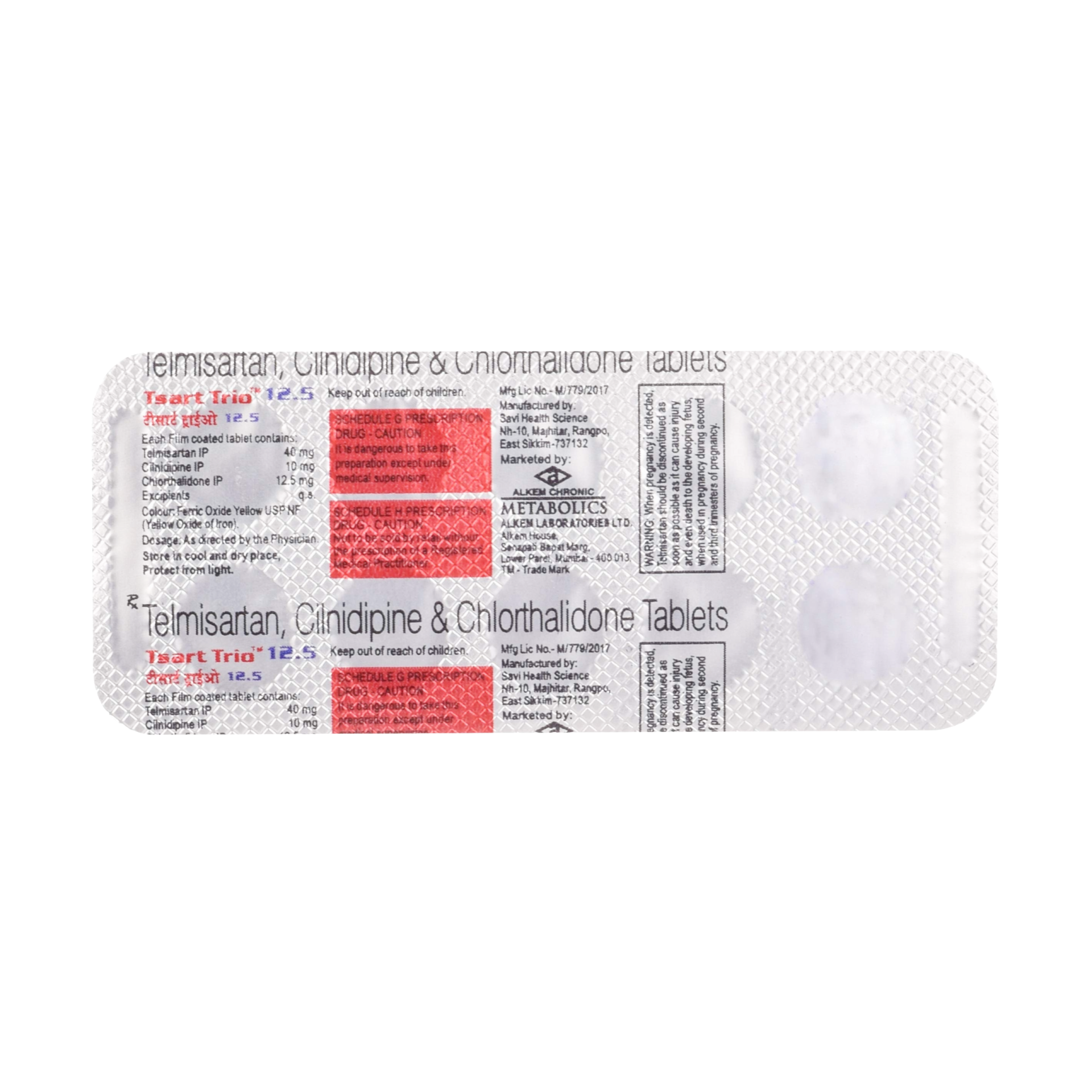 This medication combines three distinct antihypertensive agents: Telmisartan, an angiotensin II receptor blocker (ARB); Amlodipine, a dihydropyridine calcium channel blocker (CCB); and Hydrochlorothiazide, a thiazide diuretic. Telmisartan works by blocking the effects of angiotensin II, leading to vasodilation and reduced blood pressure. Amlodipine relaxes the smooth muscles in blood vessel walls, further promoting vasodilation and decreasing peripheral resistance. Hydrochlorothiazide increases the excretion of sodium and water by the kidneys, reducing blood volume and consequently blood pressure.