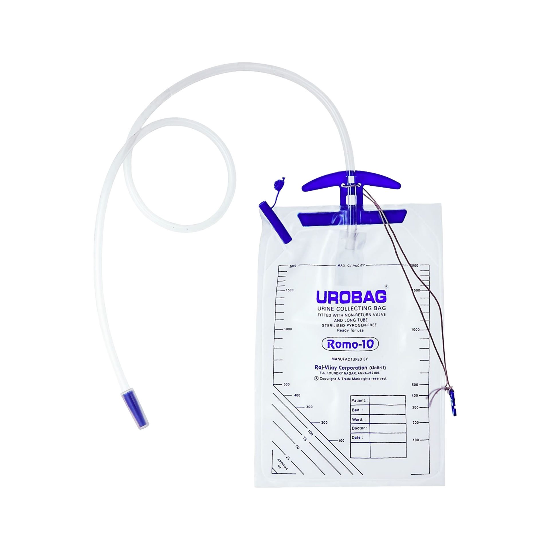 A Uro Bag, or urine drainage bag, is a sterile, closed-system collection device specifically designed to work in conjunction with an indwelling urinary catheter. The designation 'ROMO-10' likely indicates a particular brand or model, signifying its adherence to specific manufacturing standards. These bags are engineered with critical features, such as a non-return valve, to effectively prevent the retrograde flow of urine back towards the bladder, which is a primary mechanism for minimizing the risk of catheter-associated urinary tract infections (CAUTIs). They provide a secure and hygienic reservoir for collecting urine drained from the bladder, allowing for continuous monitoring of output and facilitating patient comfort. Typically equipped with a drainage port for easy emptying and available in various capacities, Uro Bags are fundamental in maintaining a sterile urinary drainage system in hospitalized or home care settings.