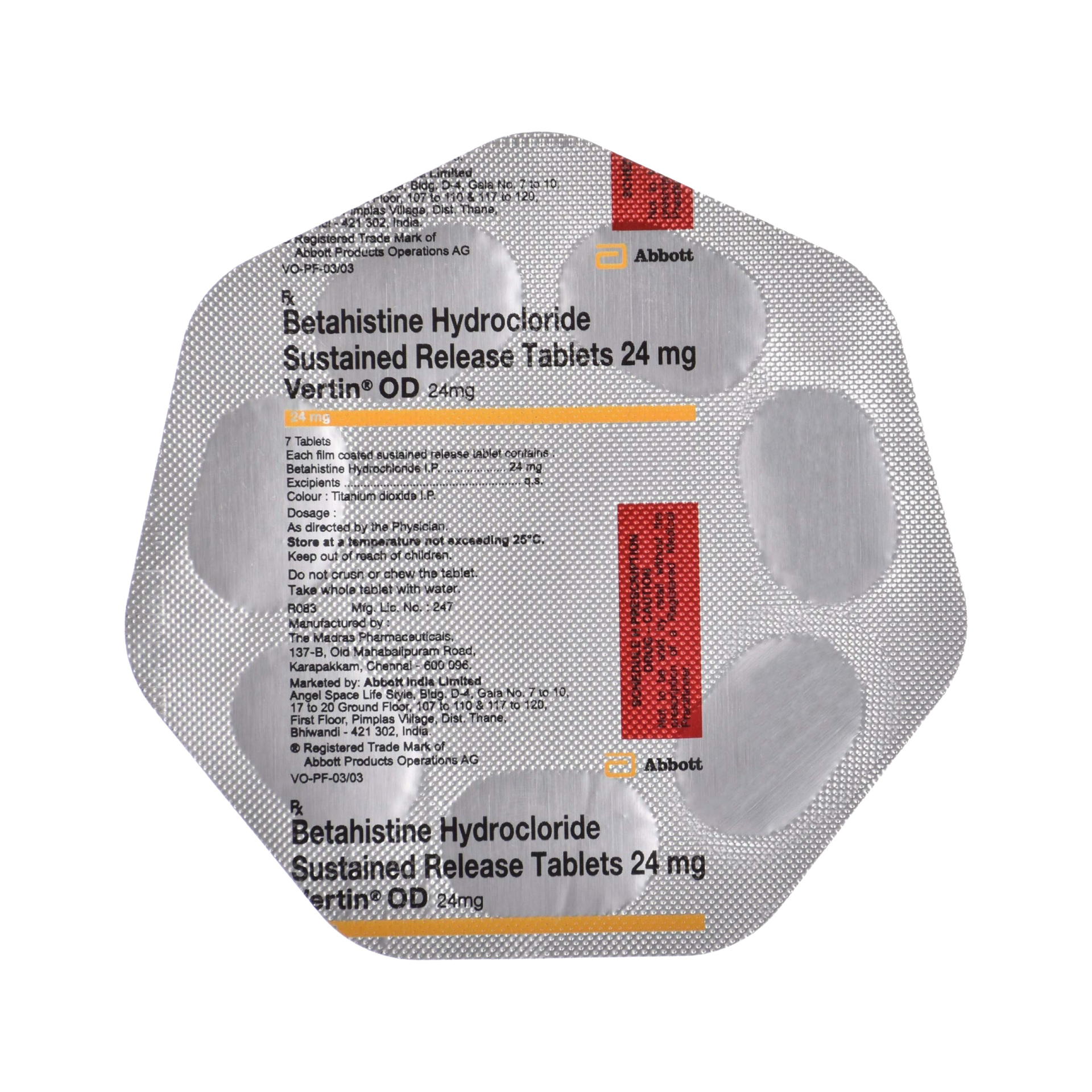 Vertin OD (Once Daily) tablets contain Betahistine, a synthetic analog of histamine, primarily indicated for the symptomatic treatment of Meniere's disease and various forms of vertigo. The precise mechanism of action is complex but is believed to involve multiple pathways. Betahistine acts as a weak agonist at histamine H1 receptors and a potent antagonist at histamine H3 receptors. This dual action is thought to enhance microcirculation within the inner ear, particularly in the labyrinth, by causing vasodilation and increasing permeability.