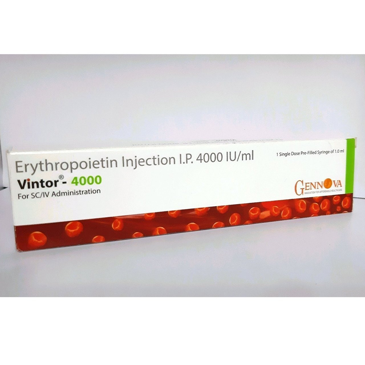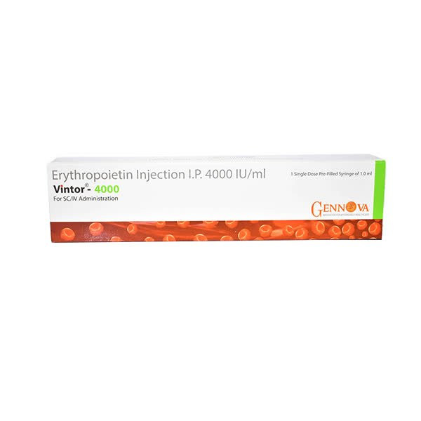 Vintor 4000 IV contains Erythropoietin alfa, a recombinant human erythropoietin, which is a glycoprotein hormone crucial for stimulating the production of red blood cells. Erythropoietin is naturally synthesized by the kidneys and acts as the primary regulator of erythropoiesis, the process of red blood cell formation in the bone marrow. This medication is administered intravenously to address various forms of anemia, most notably anemia associated with chronic kidney disease, where the kidneys fail to produce sufficient natural erythropoietin. It is also utilized to manage chemotherapy-induced anemia in cancer patients and to minimize the necessity for allogeneic blood transfusions in specific surgical contexts. By binding to erythropoietin receptors on erythroid progenitor cells within the bone marrow, Erythropoietin alfa promotes their proliferation, differentiation, and maturation into functional red blood cells, thereby increasing hemoglobin levels and improving oxygen-carrying capacity.